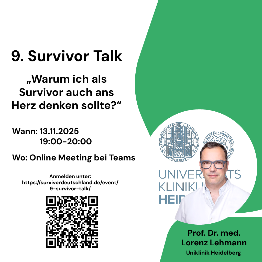 Wir laden euch herzlich zum 9. Survivor Talk ein. Dieser findet am 13.11.2025 um 19 Uhr statt. Als Gast freuen wir uns dieses mal Prof. Dr. med. Lorenz Lehmann begrüßen zu dürfen. Er wird uns mitnehmen in das Thema „Warum ich als Survivor auch ans Herz denken sollte?“. Wir freuen uns auf Euch! Biografie: Prof. Dr. […]